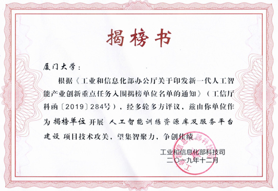 2021年4月19日,中华人民共和国工业和信息化部发布“新一代人工智能产业创新重点任务揭榜优胜单位”,厦门大学作为仅有的两所高校成功晋级。“揭榜优胜单位”是工信部对遴选出的揭榜单位经实地考察、专家评议和第三方专业机构测评等多维度评价,优中选优遴选出来的单位。